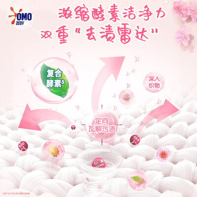 添加去渍因子,快速瓦解难洗的污渍,去渍彻底,衣服恢复洁净。樱桃前调配以樱花中调,香氛甜美,持久留香,洗后的衣服散发迷人香气。