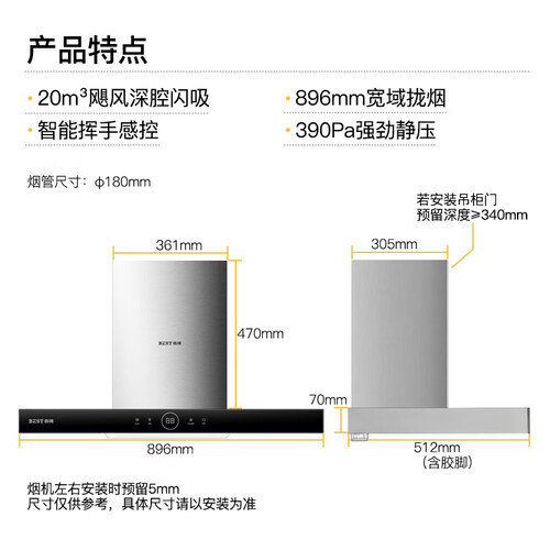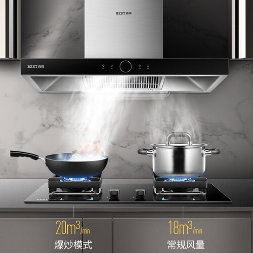 20立方深腔闪吸技术,油烟外排无需拐弯,提升排烟速度。3min延时关机功能,自动净除厨房残留余烟,重现清爽烹饪环境。