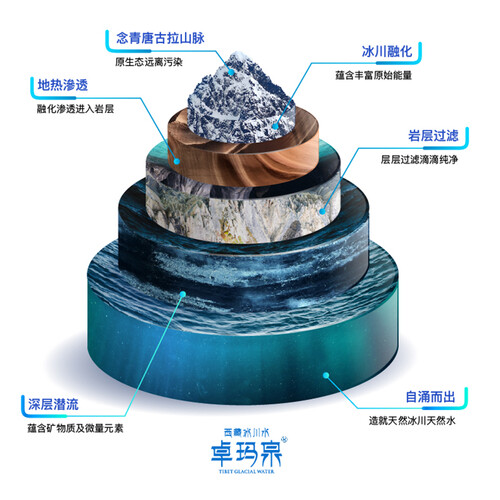 源自高海拔的西藏冰川,经过砂层的天然过滤,水质不仅变得干净,且富含各种元素。它的水分子活性很强,可帮助人体进行吸收。