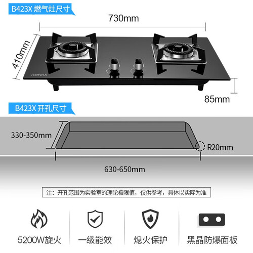 钢化黑晶玻璃材质的面板,外观精美时尚同时不易沾油污,使用后更便于清洁,一擦即净不费心。台式嵌入式两用,满足安装需求。