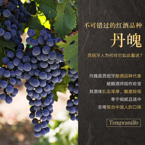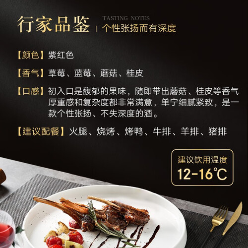 细腻的单宁,口感醇厚紧实,香味浓郁突出。黑金色的瓶身设计,彰显深沉稳重的气质,送礼或待客都适宜。