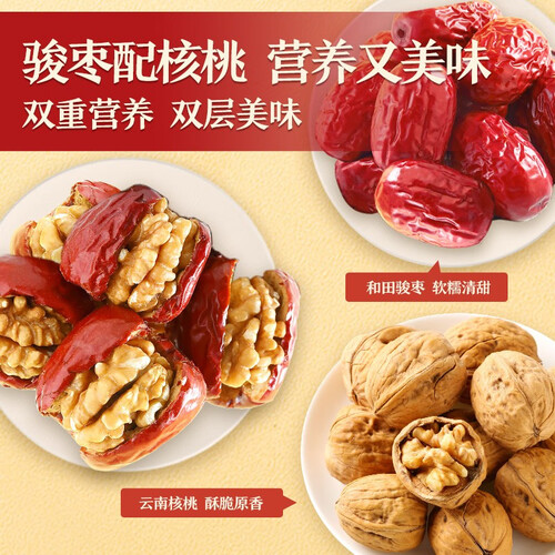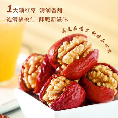 大颗饱满的红枣搭配香脆细腻的核桃仁,结合了红枣的清甜和核桃的酥脆,搭出营养好滋味。不添加食品添加剂,安全健康。