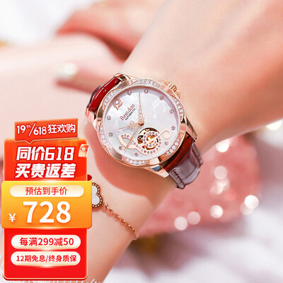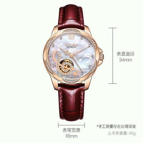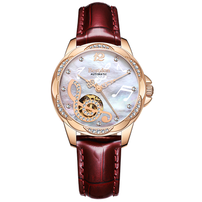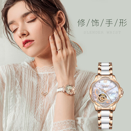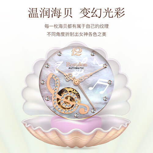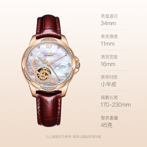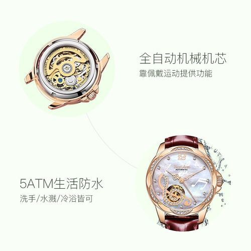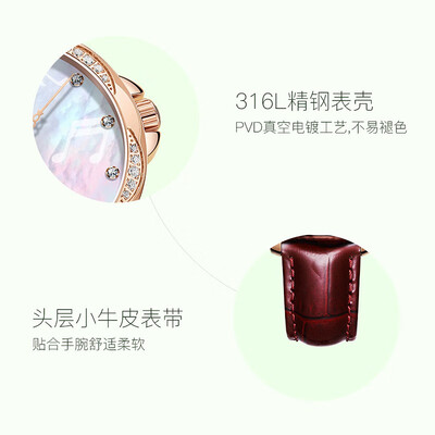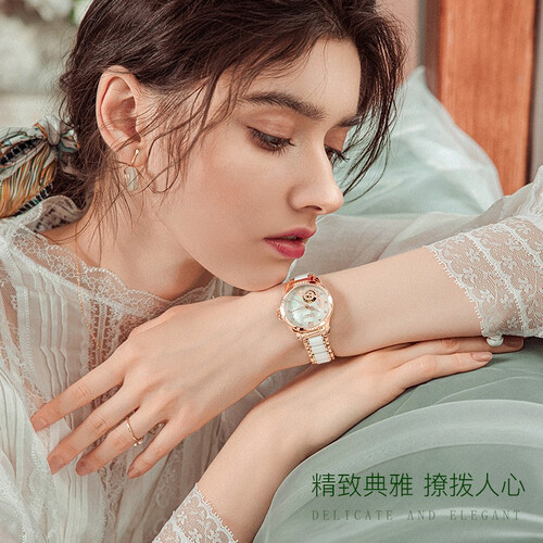 表壳采用立体镶钻叠加花朵表圈工艺,散发耀眼光芒,更显精致格调。质感玫瑰金采用PVD真空电镀工艺,长久保色,久戴不易变色。