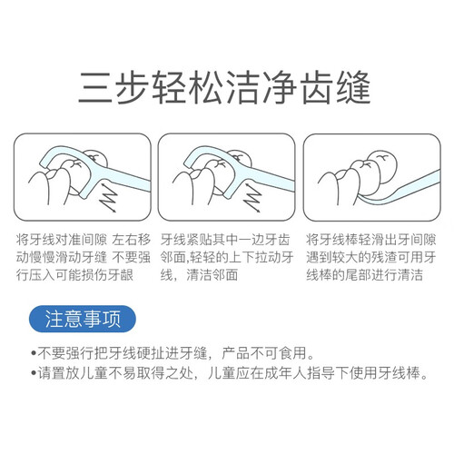牙线很强韧,深入清洁齿缝不易断裂,尾部尖端可以当牙签用,很圆滑,不会伤到牙龈。