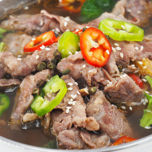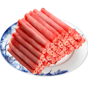 甄选国产谷饲高品质的牛肉为原材料,肉质色泽鲜红,其纹理清晰可见。肉卷薄厚均匀,肥瘦相间,每一口享用都鲜香诱人。