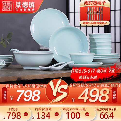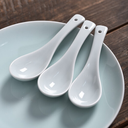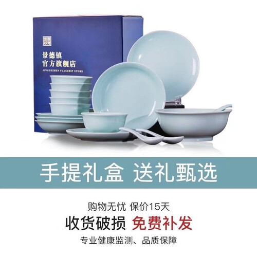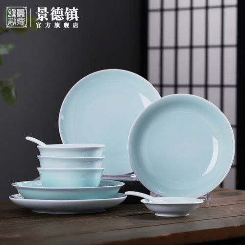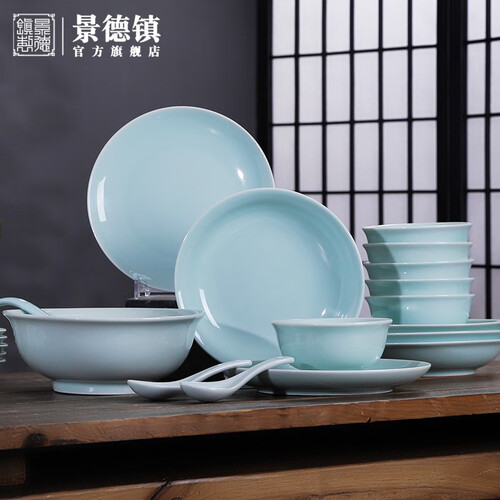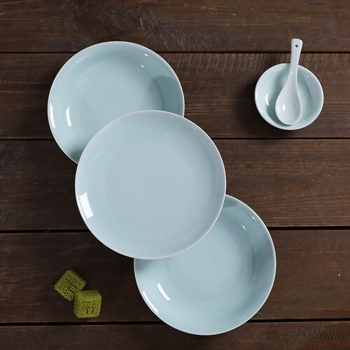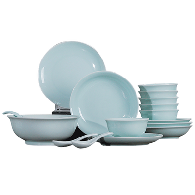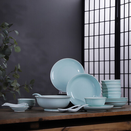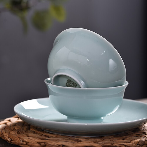 餐具套餐由色白花青的影青瓷制成,成品继承了清淡典雅的气质以及晶莹剔透的高透光性,让用餐也享受玉瓷之美。