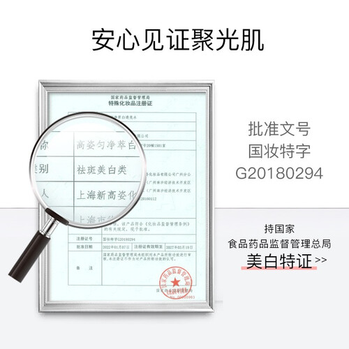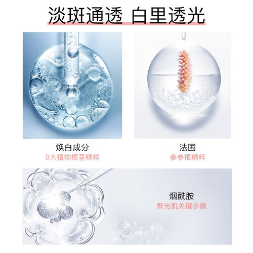 采用烟酰胺,降低肌肤水分流失,使肌肤达到均匀提亮肤色的效果。法国拳参根精粹,加速角质层更新促进吸收。
