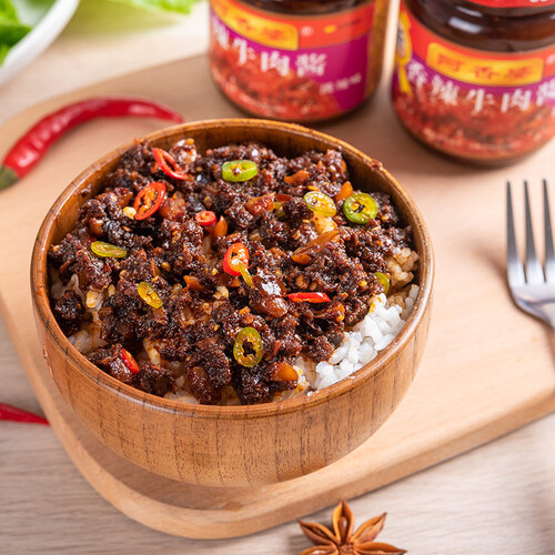 坚持先进的工艺精心熬制,牛肉酱口感香辣油润、咸淡适宜,用于佐餐、点蘸菜肴或炒菜调味风味俱佳,花样吃法满足不同的口味需求。