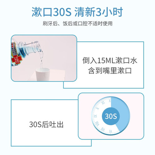 漱口水内含有微量的氯化钠成分,实力强健牙釉质,只需30秒,就可快速吸附口腔异味,带走齿间异物,畅快清爽无需等待。