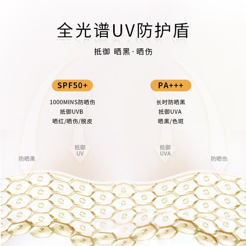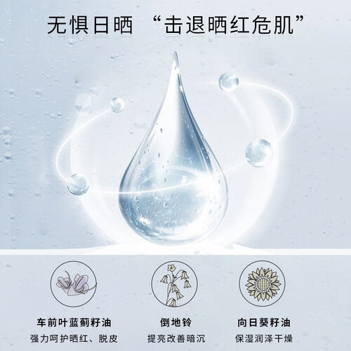 采用水溶与油溶的防晒剂,经过科学配比,涂抹后可呈现明亮水光肌。添加倒地铃花、车前叶蓝蓟籽油等成分,舒缓修护,改善肌肤干燥。