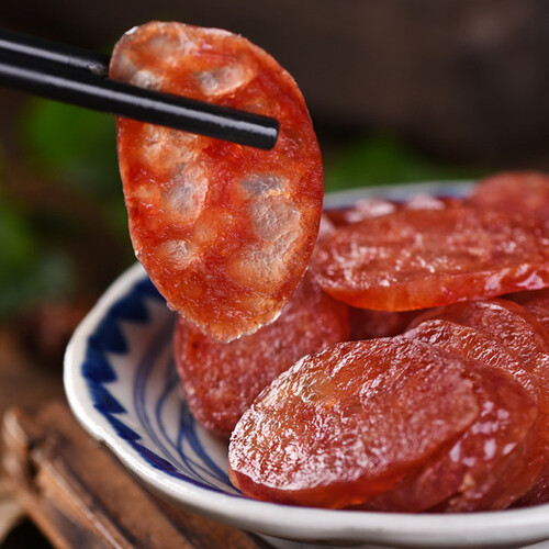 以肥瘦相间的猪肉作原料,经过多道工序加工制作而成,肉质紧实,口感醇香。