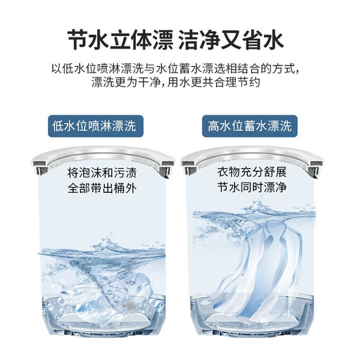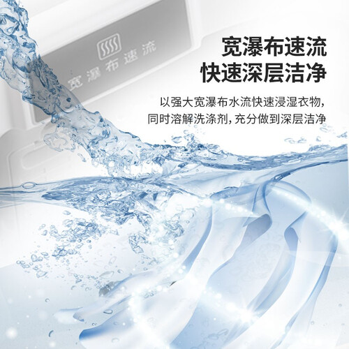宽瀑布水流漂洗,能够充分浸泡衣物,带来更好的去渍能力。配备光滑镜面内桶,有效减少对衣物的磨损,不损伤面料。