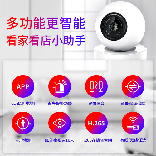 呆萌的外形设计,配以白色机身,灵动亲和。WIFI环境下就可稳定工作,安装非常的简单。夜间可开启无红眼模式,成像更真实。