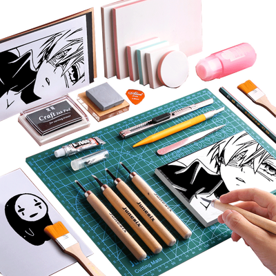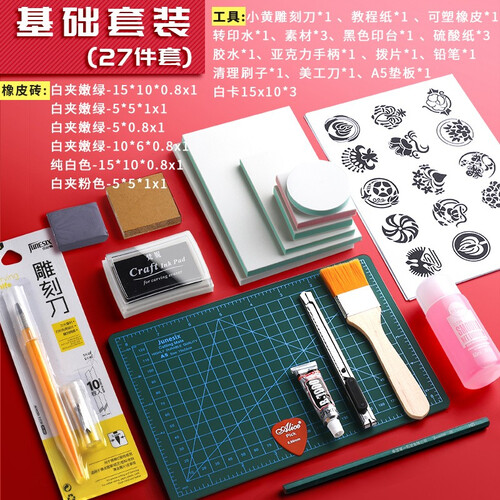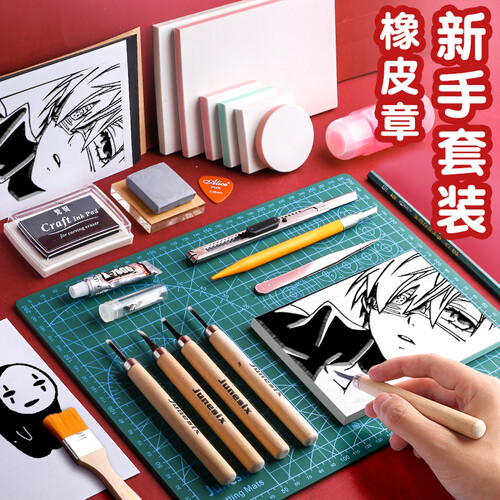 这是橡皮章雕刻的入门套装,囊括了雕刻刀、十色可揭橡皮砖等,可以让DIY爱好者根据自己的爱好,雕刻出喜欢的橡皮章。