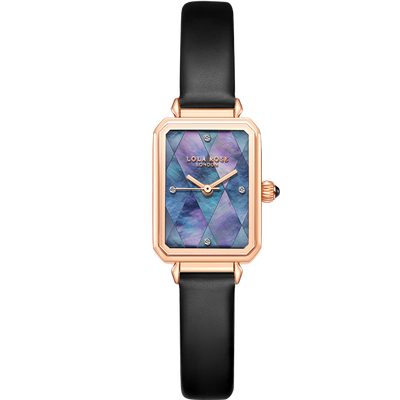 方形蓝贝表盘,菱形切割设计,与镶钻时标相结合,演绎出浪漫复古风格。针扣牛皮表带,便于摘戴调节,触感也柔软舒适。