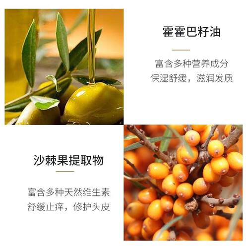 提取了霍霍巴籽油,拥有多种营养成分,可以锁住头发水分,保持湿润。添加沙棘果提取物,能够有效止痒,可以修护受损头皮。