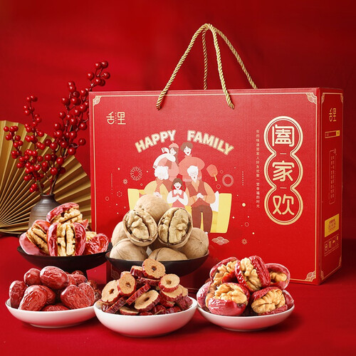 礼盒内包含了薄皮核桃、大枣夹核桃、甜心灰枣、红枣夹核桃和红枣脆片,营养美味。精致红色礼盒包装,年货好选择。