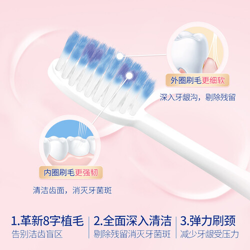 全新科学的刷毛布局,打造出细软的外圈刷毛与强韧的内圈刷毛,有助于清除牙龈上的残留与清洁齿面,不放过每个角落。
