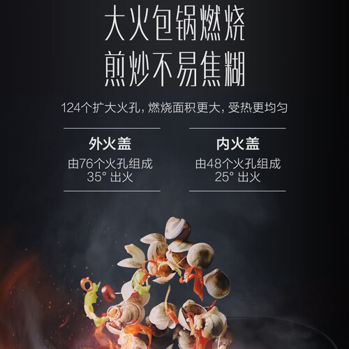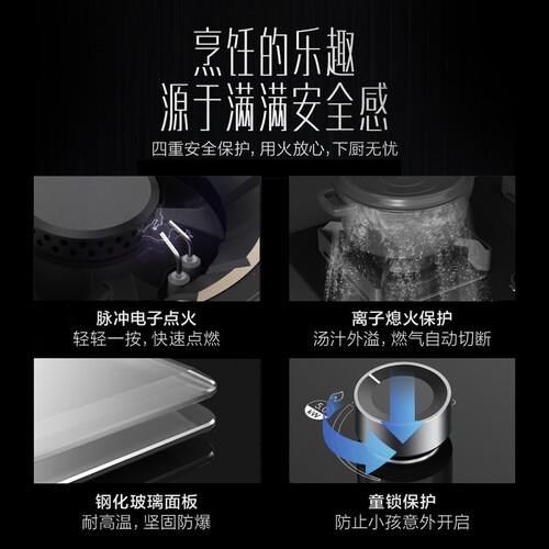 内置124个扩大火孔,受热面积更大锅体受热更均匀,搭载脉冲电子点火,迅速点燃无需等待,安全童锁保护防止产生意外。