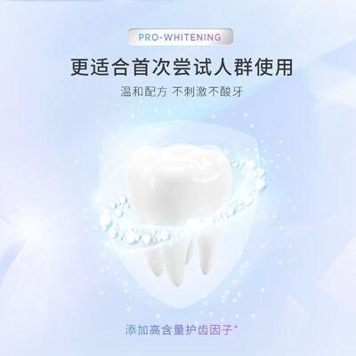 3重焕白技术,破坏色素粘附载体,分解多年沉积牢固牙渍,协同温和护齿因子,不刺激不酸牙,无水高粘性设计,纤薄隐形舒适不掉。
