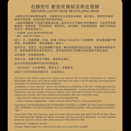 富含活性玫瑰酵素成分,抗氧化吸收效果好,有效改善肌肤暗沉无光。采用备长炭纤维膜布,吸附力强净透毛孔更干净。