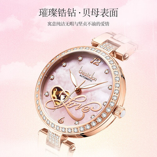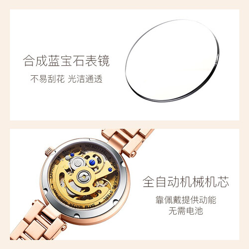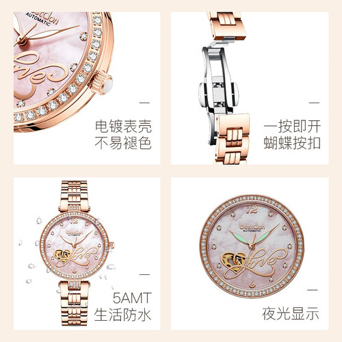 采用蓝宝石表镜,抗磨不易刮花,双面镀膜增透工艺,光洁通透易读时。精选天然贝母表盘,珍珠般闪耀光泽,不同角度折射各色的光。
