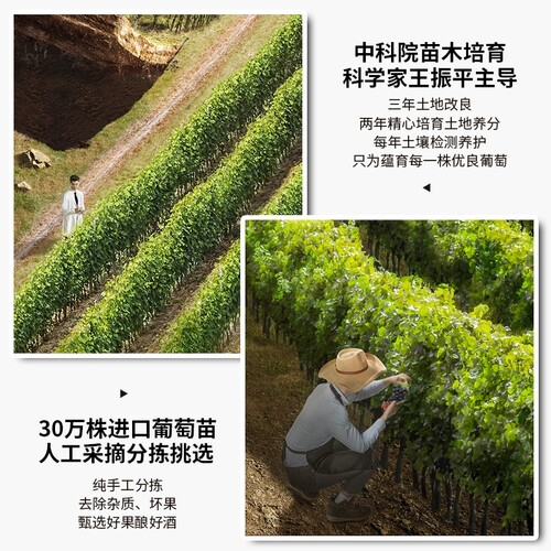 产自贺兰山黄金酿酒地带,气候环境适宜葡萄生长,日照充足,葡萄饱满多汁。采用手工采摘分拣,甄选优质好果,酿造品质好酒。