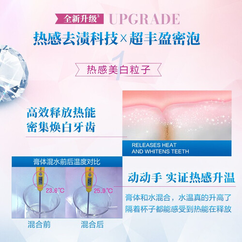 采用热感去渍科技结合超丰盈密泡,实力清扫黄渍,密集焕白牙齿,不让牙渍黄牙影响社交形象,助精致党情人节约会更甜蜜。