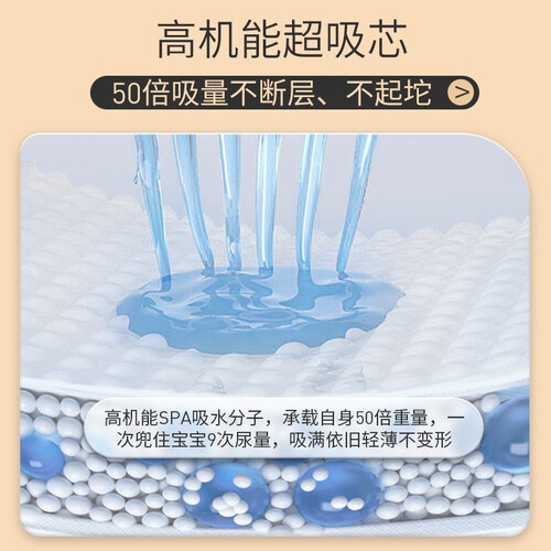 薄至两毫米厚度,纤薄随身,让宝宝自由扭动,同时快速透出湿气,不憋闷。含有大量悬浮SAP吸水珠,快速吸干尿液,干爽舒适。