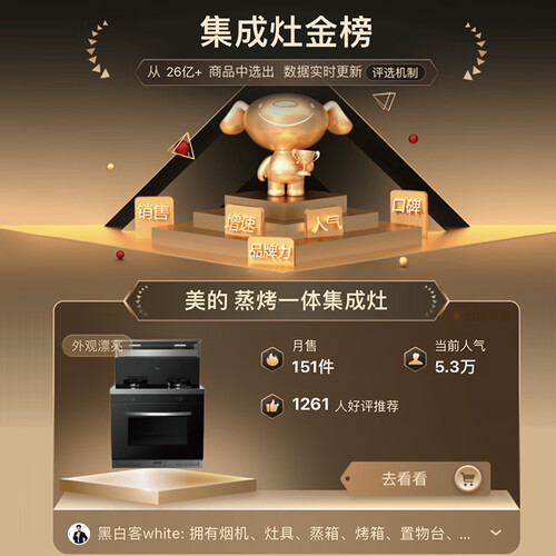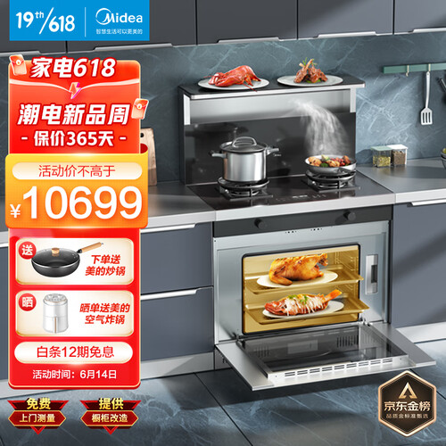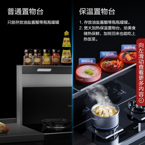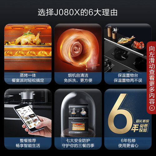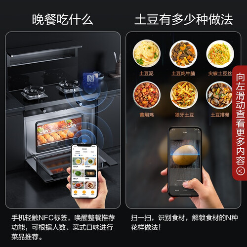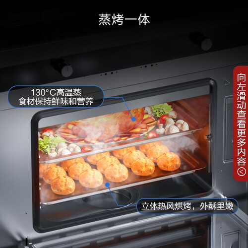 拥有烟机、灶具、蒸箱、烤箱、置物台、保温台等多项功能,实用性更强。60L蒸烤大容量,满足多人派对花样用餐需求。