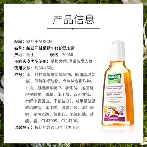 富含母菊花植物精华,修复受损发丝,改善头发分叉,令头发水润健康;采用纯草本精油提取,深彻洗净同时滋养头皮。