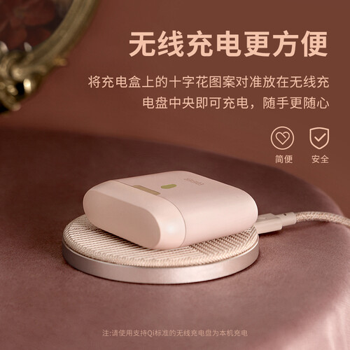 支持无线充电,随放随充,安享更简单方便的充电体验,拒绝无谓等待;采用符合人体工学的斜入耳设计,舒适佩戴一整天。