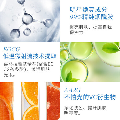 富含99%的精纯烟酰胺成分,击退暗沉粗糙,焕发白皙。采用低温微射流技术提取,可以直达肌肤深层,增强肌肤的光滑水润度。