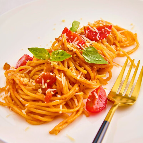 意大利原产地直接进口直身面,面条口感劲道扎实,搭配经典番茄肉酱,新鲜蔬菜、大块食材美味看的见。