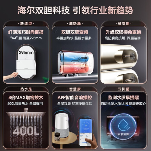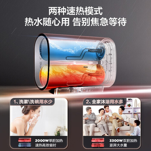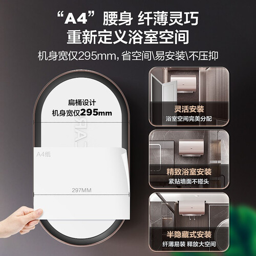 打造扁桶机身,纤薄轻巧,贴墙安装不受限,省时省力。双胆加热模式,灵活加热,满足家庭不同时段洗浴需求。