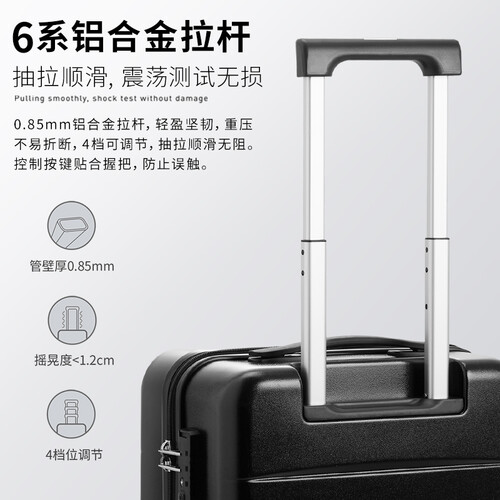 采用表面磨砂工艺,有效防刮花,令箱体长久持色。铝合金拉杆经过加厚处理,4档可调满足你的不同使用习惯。
