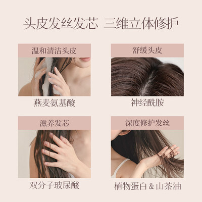 神经酰胺添加,针对受损屏障,实现高效修复,双分子玻尿酸成分,大分子形成发膜保护,小分子高渗护理,使发丝根根分明。