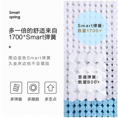 Smart智慧弹簧包含1700+枚独立弹簧,多圈数、多支点,拒绝塌陷,舒适承托,睡出健康体型,2CM天然乳胶,高弹透气不闷热。