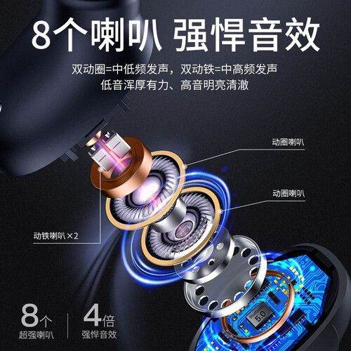 充电仓智能显示剩余电量,可避免突然没电的尴尬。此外采用真无线设计,没有任何线缆的束缚,佩戴更舒适。