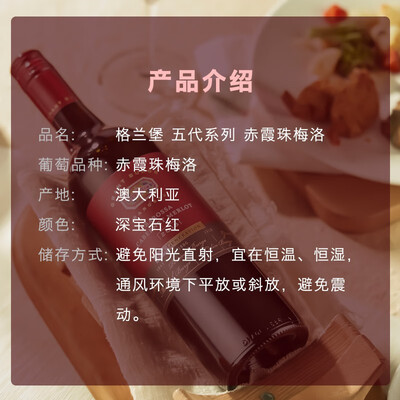 深紫色调的酒体,入口饱满柔顺,浓郁的果香在口中持久弥漫,回味无穷。经典的瓶身,商务宴请或送礼彰显出不凡品位。