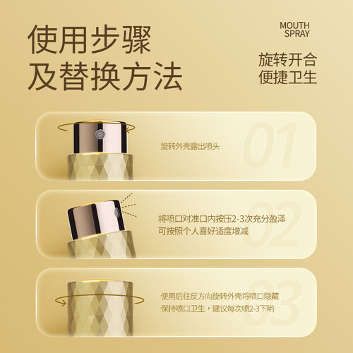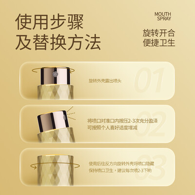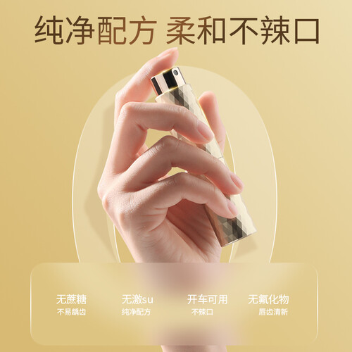 采用旋转式开合,按压喷雾,水雾张力较强,质感细腻,能直达口腔每一个角落,淡淡的薄荷清香,拒绝口气。