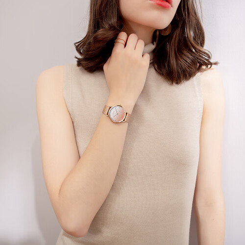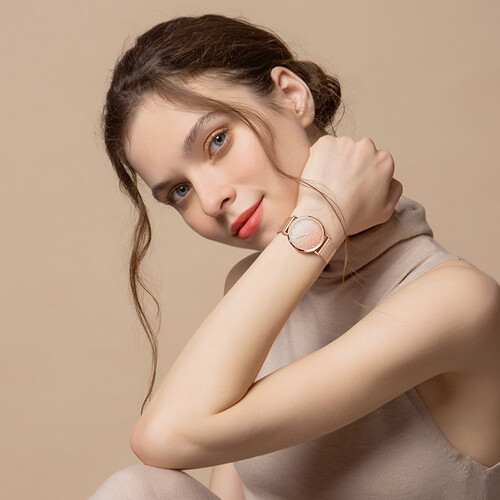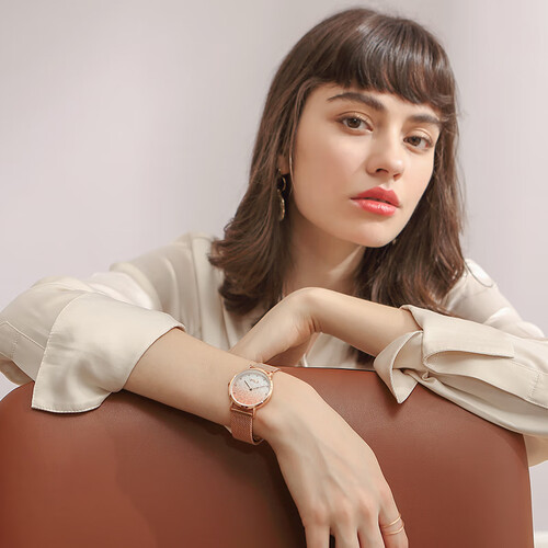 闪钻的表盘设计,凸显抛光工艺表圈,闪显悦目的光泽质感。金属质感舒适刻度与指针呈现,散发出人文艺术格调。