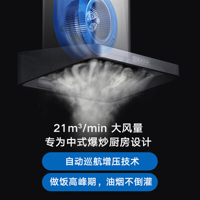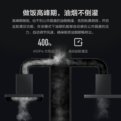 宽幅拢烟,加入增压导流板,形成环形负压区大面积扩张,拢烟效果更强劲。巡航增压技术,自动感应公共烟道压力,油烟顺畅排出。