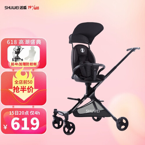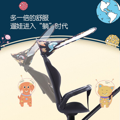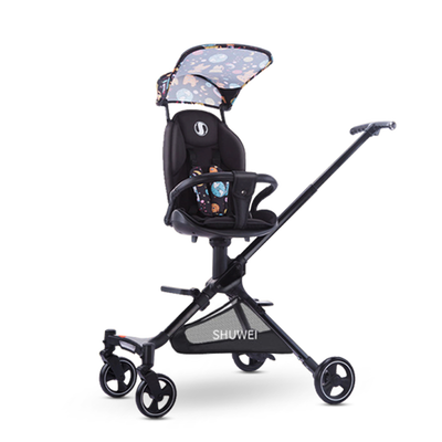婴儿车可以单手操作,双向旋转,能够顺滑地滑行。黑色车身,沉稳内敛,帅气十足。