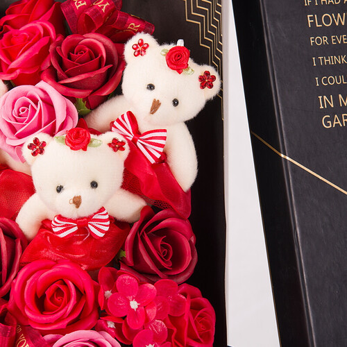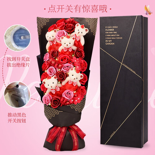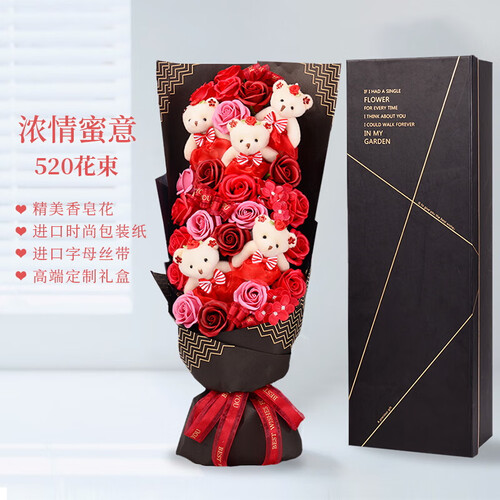 由五只小熊和二十朵香皂玫瑰花组合而成,有着我爱你的寓意,不禁意之间就可以向心爱的她传递出你的爱,充满浪漫气息。