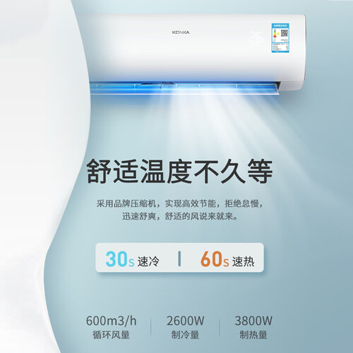 能效升级,一键开启ECO模式,全天开启也不担心电耗问题,节能省电。品质压缩机,大风量快速冷暖,30s快速制冷。