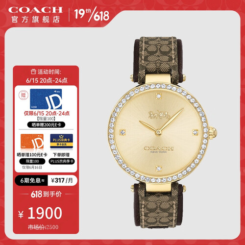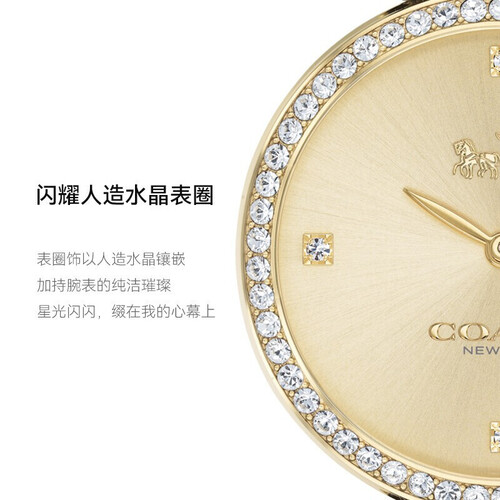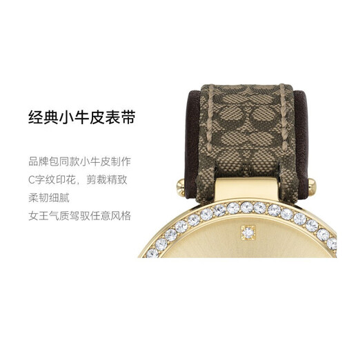 表盘外圈镶嵌水晶石,绽放璀璨动人光芒,为腕间增添几分华贵典雅。带有C标压纹的牛皮表带,经典时尚富有品牌辨识度。