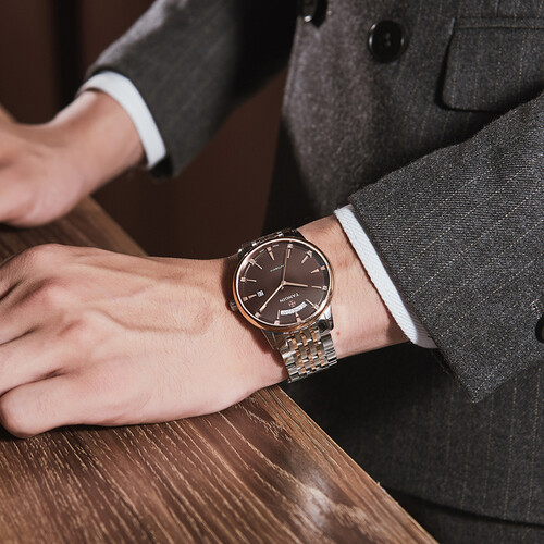 表盘放射状的纹理如同太阳的光芒,细腻又闪耀。刻度位置点缀的细小锆石与长形条钉组合,简约又充满精致的魅力,让人爱不释手。