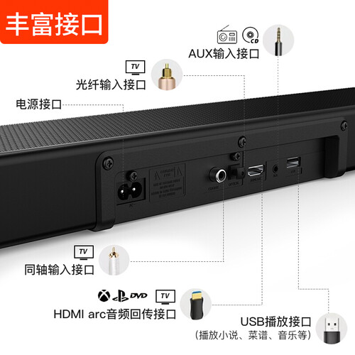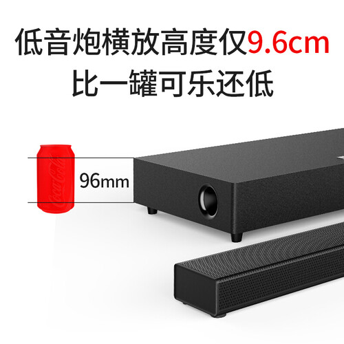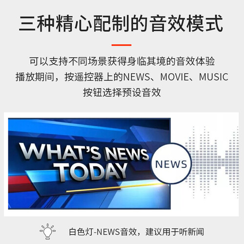 有超薄低音炮和2.1声道条形音箱组成,提升电视节目音效。内置三种音效模式,不同场景用不同音效,获得身临其境的音效体验。