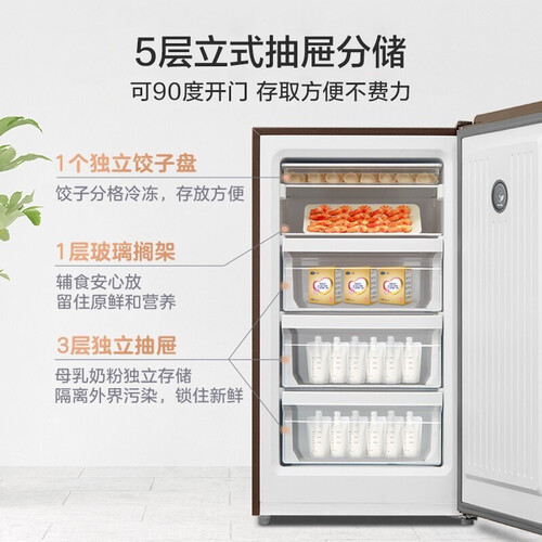 搭载净味装置,保持内部清新无异味,放心存储母婴食材,守护母婴健康。5层立式抽屉分储,收纳整洁有序,分层存储不易串味。